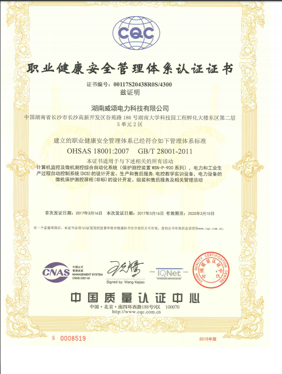 职业健康安全管理体系认证证书